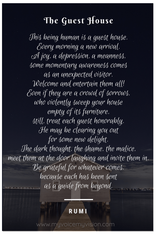 After reading through my morning “Miracles” reflection and reciting today’s daily affirmation, “I believe in miracles,” I settled in for my daily calm. The title was “The Guest House” which didn’t provide much guidance as to what I was about to tackle. I thought “Oh dear, we’re going to talk about welcoming strangers and neighbors and yadda yadda.” This made me anxious. I have no energy to welcome strangers right now and my house is beyond help, inside and out. I’m currently overwhelmed by abundance: an abundance of toys, an abundance of ill-fitting clothes, an abundance of weeds, you name it.